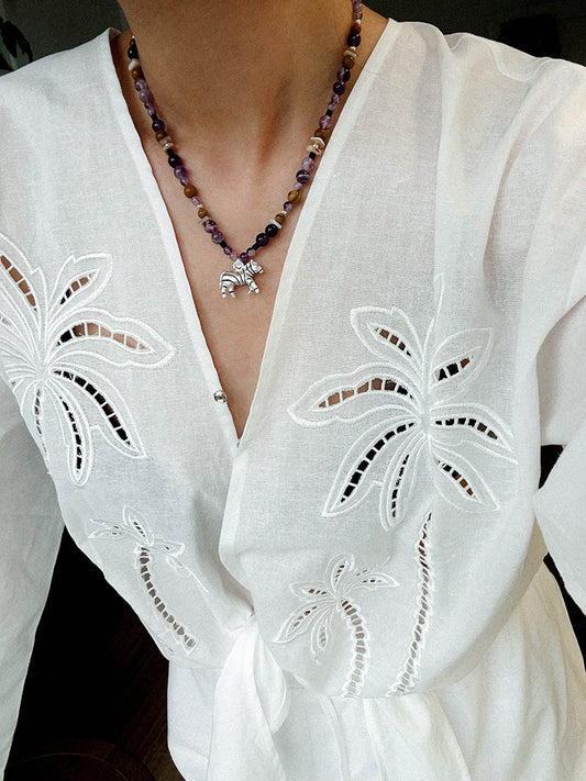 Zebra Pattern Amethyst & Wood Beaded Necklace – Lucky Year of the Horse Choker